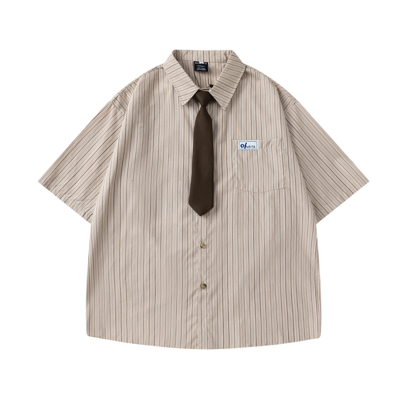 Striped Short-Sleeved Shirt Unisex College Style Loose Fit All-Match Dress Shirt with Tie